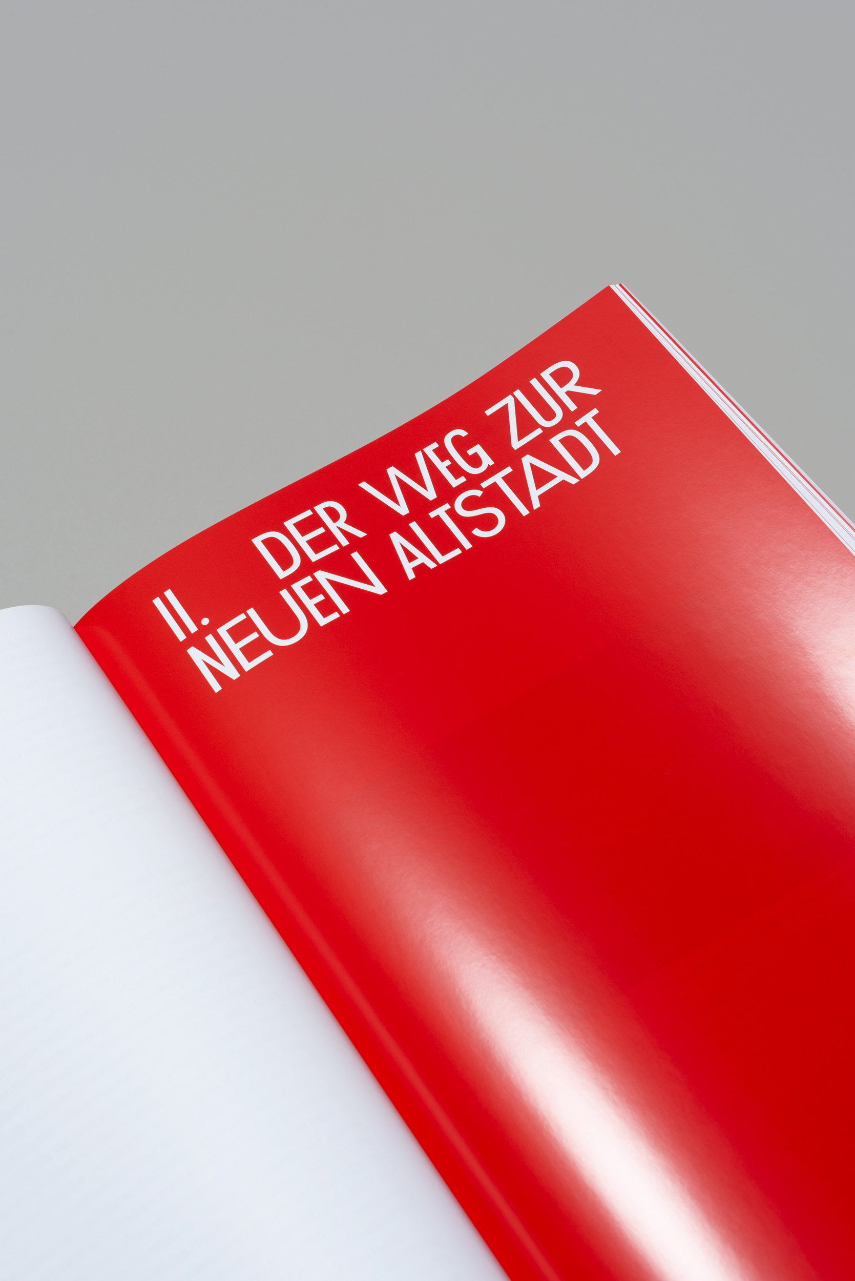 The graphic concept of the publication takes up architectural design principles of the New Old Town. Typography and grid translate the structure of houses of different widths, narrow streets and small squares and courtyards into the language of book design. This is reflected for example in the text columns of different widths, in the placement of the images and in the design of the elements used.