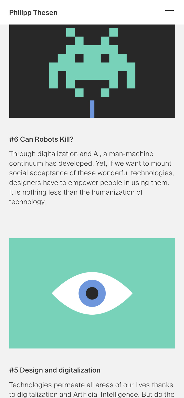 The website serves as a vessel for all different types of projects, from the past, present and future. Several illustrations were created designed to accompany the “Thoughts” category, in which Philipp Thesen writes about design and strategy, innovation and digital change.